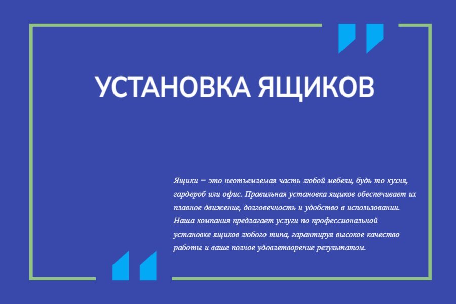 - Качество и точность. Мы используем только профессиональные инструменты и качественные направляющие, что гарантирует долговечность и надежность установленных ящиков. Вы можете быть уверены, что ящики будут работать без сбоев и заеданий.